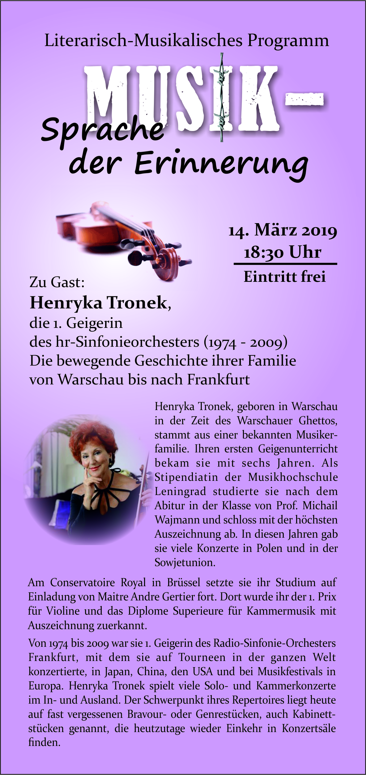 Sie spricht über ihre Mutter Halina Kowalska, eine sehr bekannte Cellistin aus Warschau, die den Holocaust überlebt hat. Begleitend spielt sie einige klassische Stücke auf der Geige. Gelesen wird aus dem Buch „Arie für Violoncello“, in welchem das dramatische Überleben von Halina Kowalska während des Zweiten Weltkrieges beschrieben wird.
